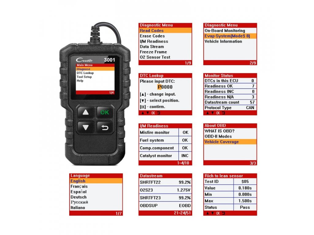 Ruční autodiagnostika Launch CR3001 umožňuje rychlou a přehlednou diagnostiku Vašeho vozidla. Diagnostika umožňuje čtení a mazání chybových kódů, IM rediness, získat informace o vozidle (VIN, CIN a CVN). Jedná se o samostatně fungující přístroj bez nutnosti připojení k PC či nákupu softwaru. Nejsou vyžadovány ani žádné baterie, přístroj je napájen z diagnostické zásuvky vozidla.